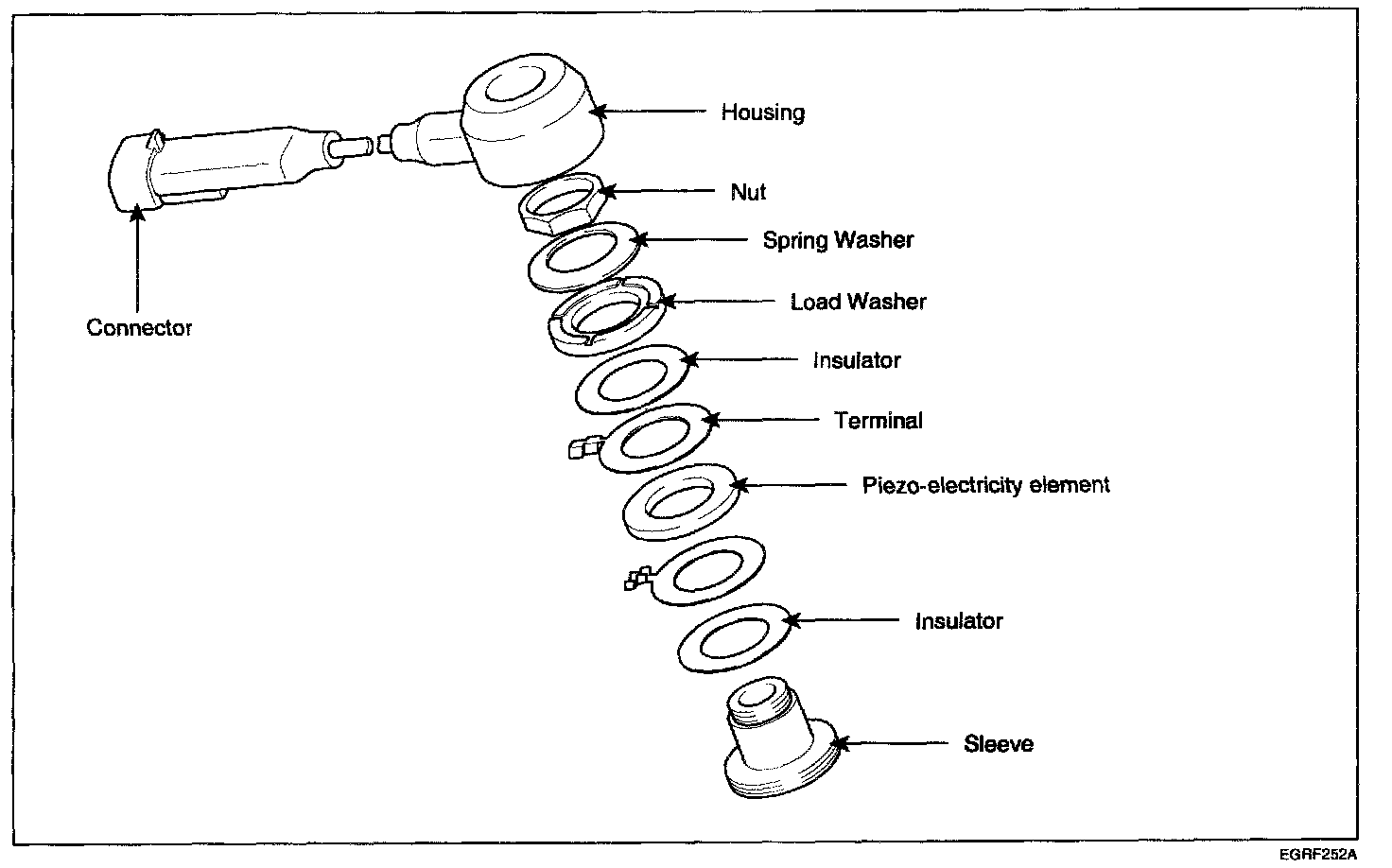 Knocking is a phenomenon characterized by undesirable vibration and noise and can cause engine damage. Knock Sensor (KS) senses engine knocking and the two sensors are installed inside the V-valley of the cylinder block. When knocking occurs, the vibration from the cylinder block is applied as pressure to the piezoelectric element. At this time, this sensor transfers the voltage signal higher than the specified value to the PCM and the PCM retards the ignition timing. If the knocking disappears after retarding the ignition timing, the PCM will advance the ignition timing. This sequential control can improve engine power, torque and fuel economy.