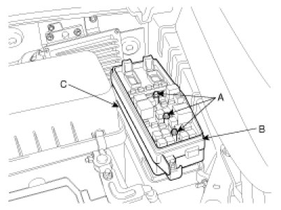 4. Remove the IPM(B) from the splash shield(C) after loosening the 3 IPM mounting bolts(A) and the IPM mounting clip.