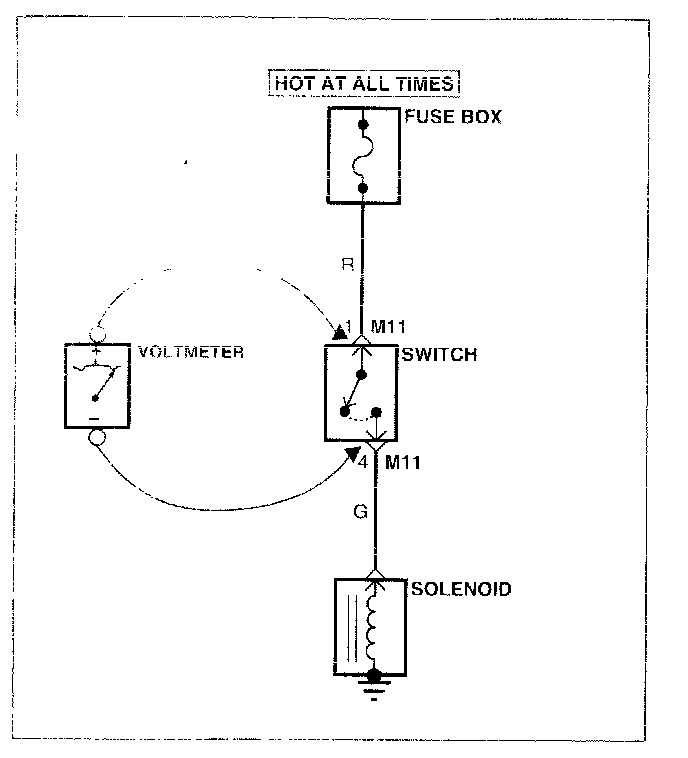 A. Connect one lead of a test lamp or voltmeter to a ground. If you are using a voltmeter, be sure it is the voltmeter's negative test lead you have connected to ground.