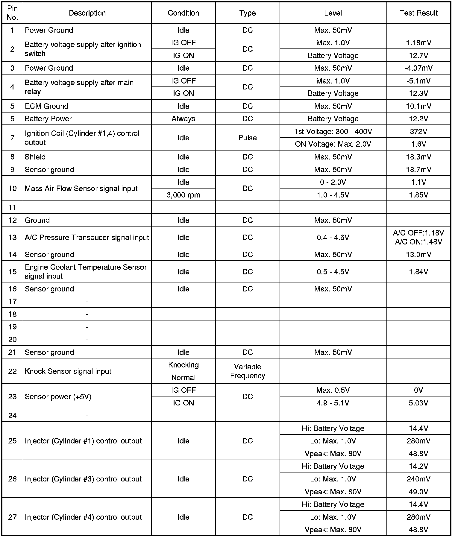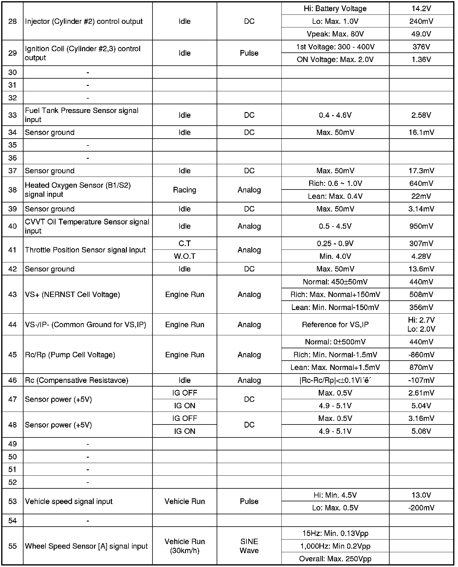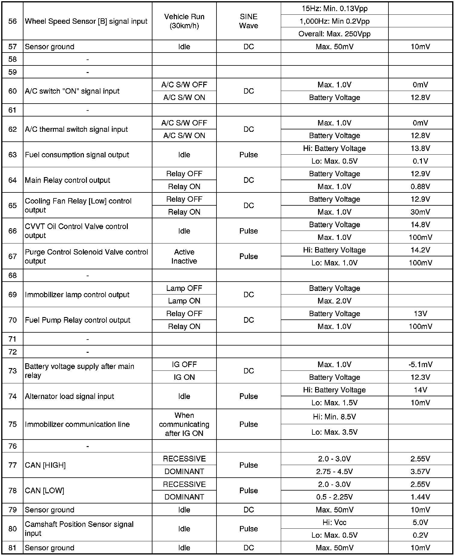 Pinout Values and Diagnostic Parameters