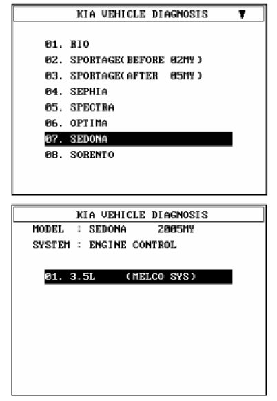 1. Select "Vehicle" and "Engine" (For example, SEDONA 3.5L V6).