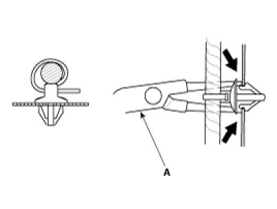 3. Slip pliers (A) under the clip base and through the hole at an angle, then squeeze the expansion tabs to release the clip.