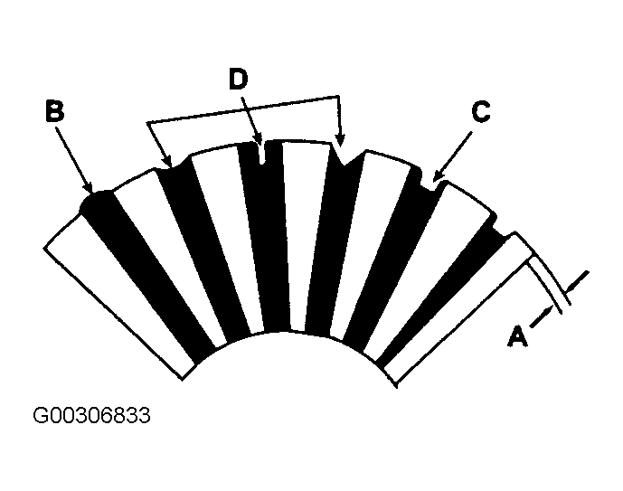 - Check the mica depth "A". See Fig 5. See STARTER SPECIFICATIONS . If the mica "B" is too high, undercut the mica with a hacksaw blade to the proper depth. Cut away all the mica "C" between commutator segments. The undercut should not be too shallow, too narrow or v-shaped "D".