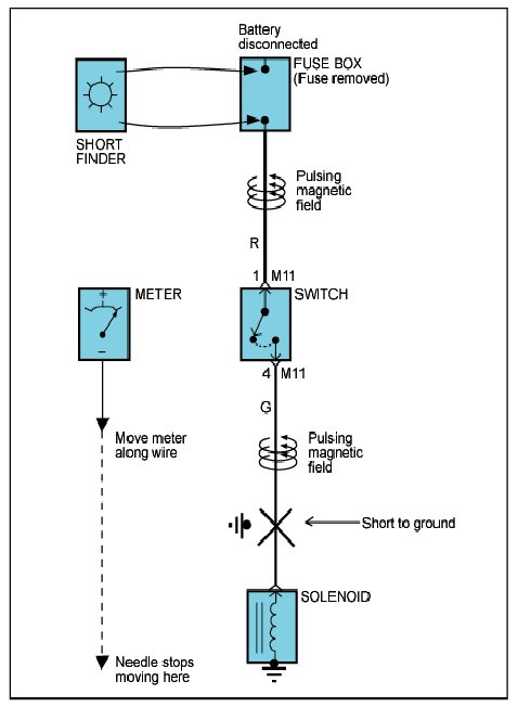 A short finder is available to locate a short to ground. The short finder creates a pulsing magnetic field in the shorted circuit and shows you the location of the short through body trim or sheet metal.