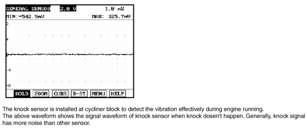 Knocking is a phenomenon characterized by undesirable vibration and noise and can cause engine damage. Knock Sensor (KS) senses engine knocking and the two sensors are installed inside the V-valley of the cylinder block. When knocking occurs, the vibration from the cylinder block is applied as pressure to the piezoelectric element. At this time, this sensor transfers the voltage signal higher than the specified value to the PCM and the PCM retards the ignition timing. If the knocking disappears after retarding the ignition timing, the PCM will advance the ignition timing. This sequential control can improve engine power, torque and fuel economy.