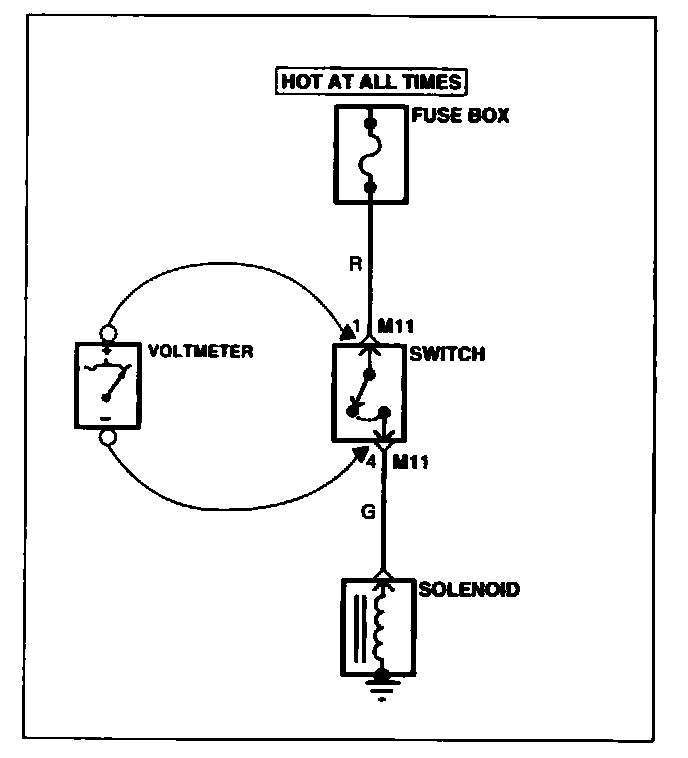 A. Connect one lead of a test lamp or voltmeter to a ground. If you are using a voltmeter, be sure it is the voltmeter's negative test lead you have connected to ground.