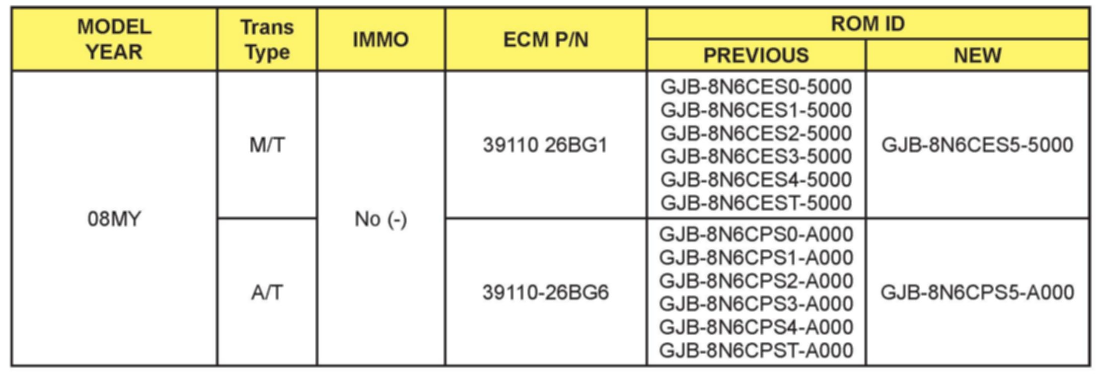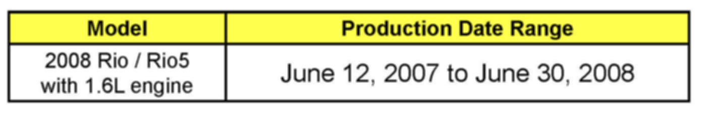 This bulletin provides the procedure to upgrade the Engine Control Module (ECM) of some 2008 RIO/RIO5 (JB) 1.6L vehicles produced June 12, 2007 to June 30, 2008 (MAP sensor vehicles only) which may experience a rough idle during initial cold start-up period and/or illuminate the MIL with DTC's below. The ECM update addresses engine roughness/misfire that may occur in the first minute of idle after cold start with coolant temperature ranging from 30-70°F and other indicated upgrades referenced below. If the engine misfire continues beyond this period refer to service manual diagnostic procedures involving engine mechanical and engine control hardware issues. For confirmation that the latest reflash has been done to a vehicle you are working on, verify ROM ID using the tables in this TSB.