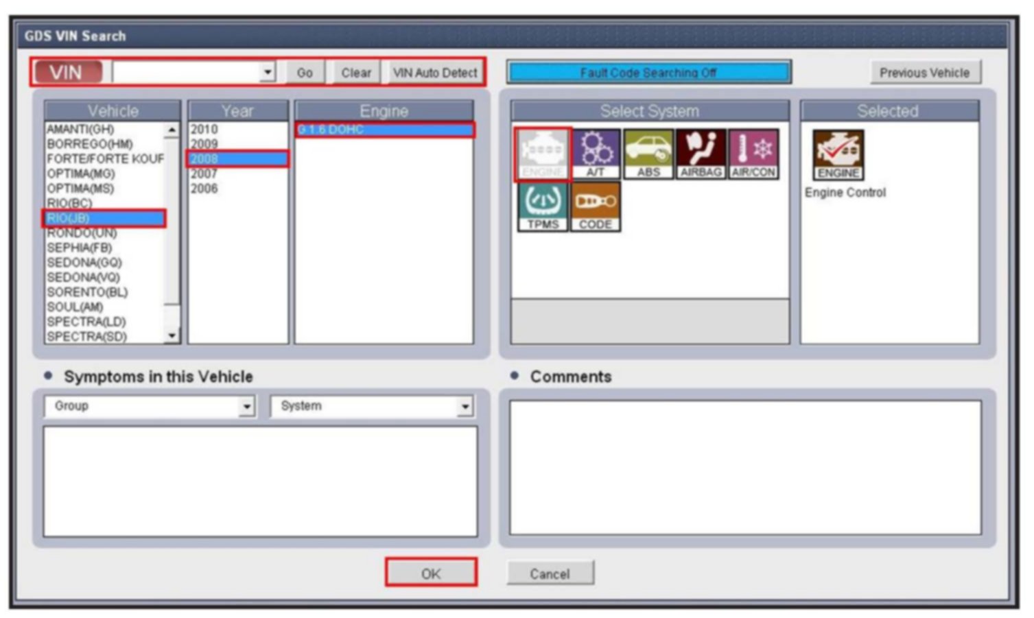 5. With the ignition key ON, turn ON the VCI and GDS tool. Access the GDS vehicle identification number (VIN) screen and configure the vehicle using the VIN AUTO DETECT Function.
