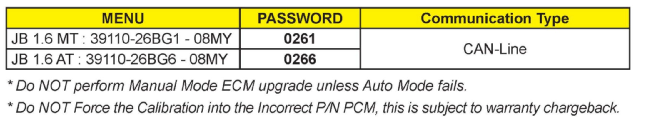 MANUAL MODE ECM UPGRADE PASSWORDS