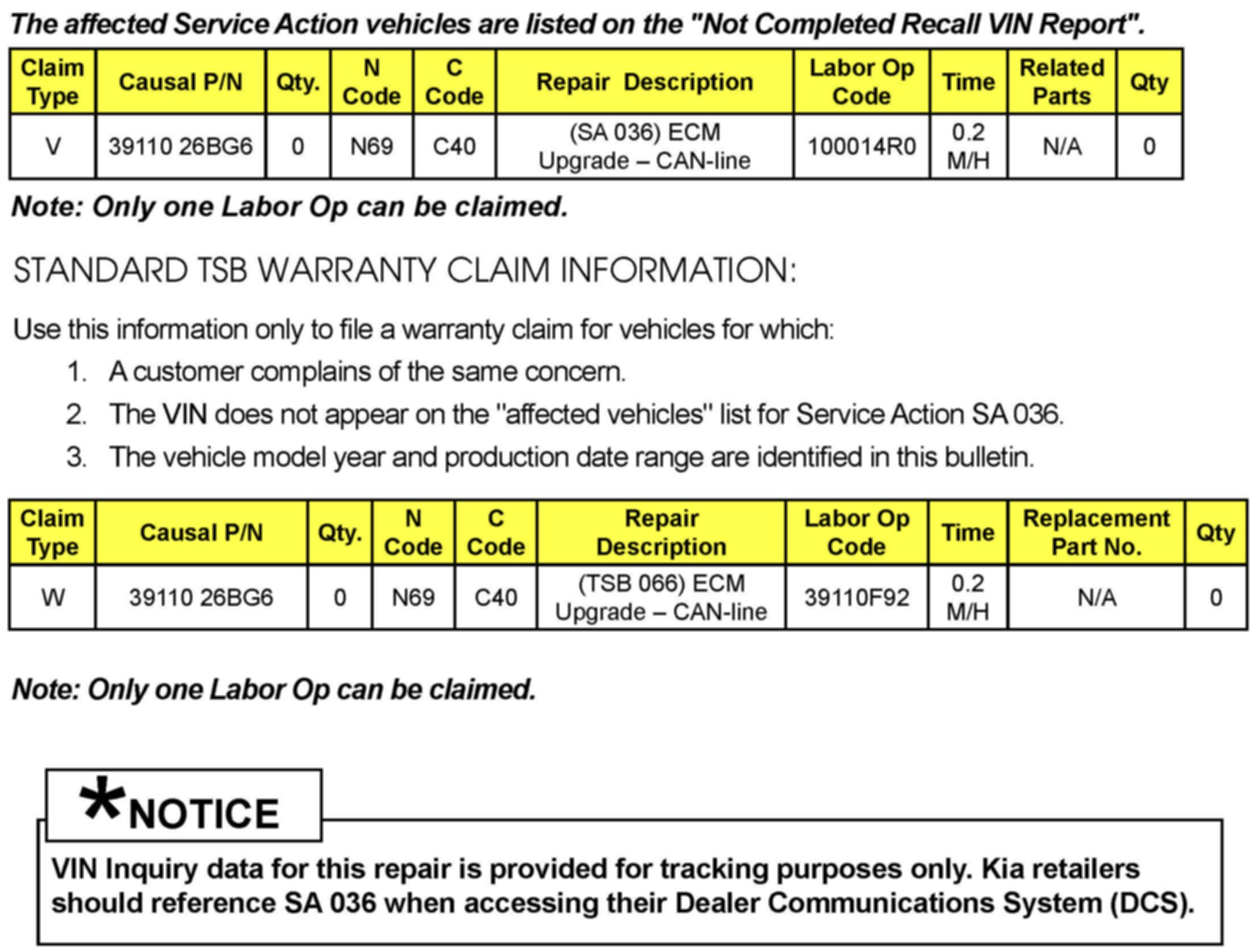 STANDARD TSB/SERVICE ACTION WARRANTY CLAIM INFORMATION