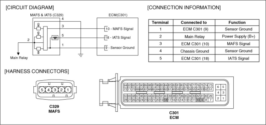 Mass Air Flow Sensor (MAFS) is a hot-film type sensor and is located in between the air cleaner and the throttle body. It consists of a tube, a sensor assembly and honeycomb cell and detects intake air quantity flowing into the intake manifold. Air flows from the air cleaner assembly through the honeycomb cell and over the hot film element. At this time, heat transfer is generated by convection and this sensor loses its energy. This sensor detects the mass air flow by using the energy loss and transfers the information to the ECM by voltage. The ECM calculates fuel quantity and ignition timing.