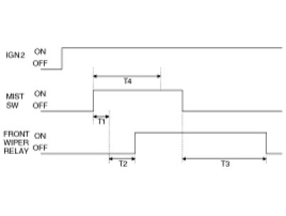 (1) In state of IGN2 SWITCH ON, when FRONT WASHER SWITCH is ON for more than T4 s(0.6s), then after T5 s (0.3s), WIPER output is ON, and after WASHER SWITCH is OFF and WIPER output is ON for T6 (3 s, the time for operating WIPER 2 - 3 times), and then WIPER output is OFF.