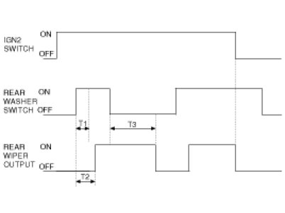 (1) In state of IGN2 SWITCH ON, when REAR WASHER SWITCH is ON for more than T1 s(0.2s), then after T2 s (0.3s), WIPER output is ON, and after WASHER SWITCH is OFF and WIPER output is ON for T3 (3 s, the time for operating WIPER 2 - 3 times), and then WIPER output is OFF.