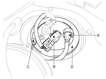 2. Disconnect the fuel feed tube quick-connector (A), the fuel tank pressure sensor connector (B), and the canister close valve connector (C).