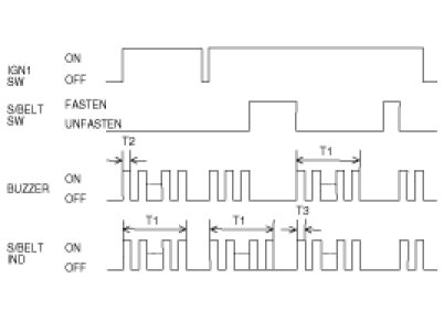 (2) If the ignition is switched off while the seat belt warning indicator and chime bell are active (Step 1) the indicator and chime bell will be switched OFF. If the seat belt is sensed as fastened during indicator and chime bell output, the chime bell will switch OFF however the seat belt warning indicator will stay illuminated for the remaining seconds.