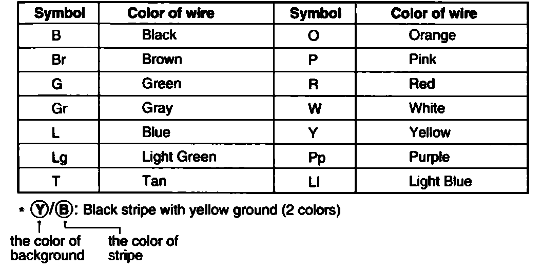 The following abbreviations are used to identify wire colors in the circuit schematics.