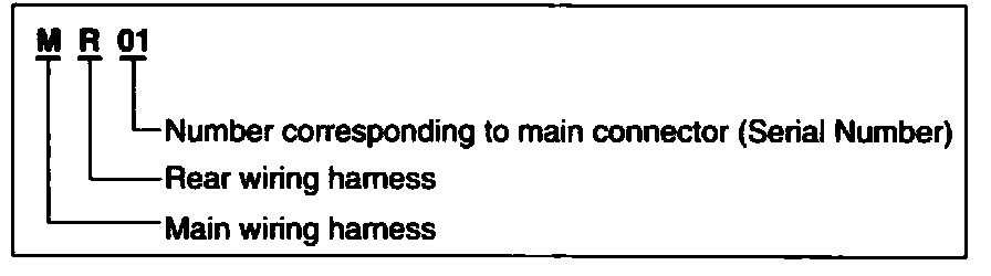 A connector identification symbol consists of a wiring harness location classification symbol corresponding to a wiring harness location and number corresponding to the connector.