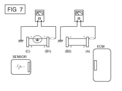 B. Disconnect connector (B), and measure the resistance between connector (A) and chassis ground, and between (B1) and chassis ground as shown in [FIG. 7].