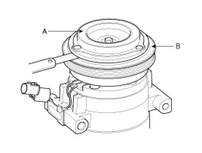 2. Check the pulley (B) bearing play and drag by rotating the pulley by hand. Replace the clutch set with a new one if it is noisy or has excessive play/drag.