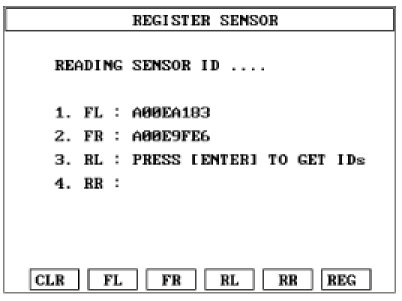 1. Read the four sensor's ids starting with sensor 1 (1 normally front left, 2 front right, 3 rear left, 4 rear right).