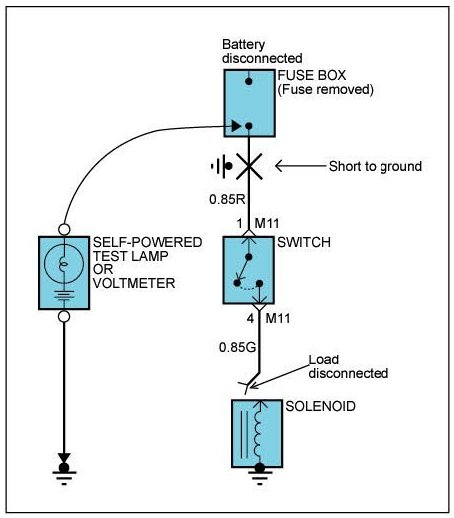 A. Connect one lead of a test lamp or voltmeter to a ground. If you are using a voltmeter, be sure it is the voltmeter's negative test lead you have connected to ground.