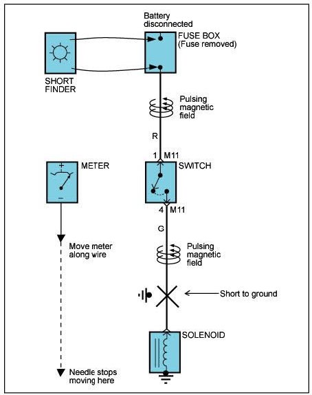 A short finder is available to locate a short to ground. The short finder creates a pulsing magnetic field in the shorted circuit and shows you the location of the short through body trim or sheet metal.