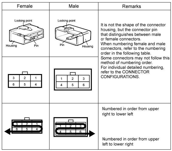 - The "Connector Configurations" section identifies connectors that are used to join hamesses together, junction connectors for common power and ground wires are also identified in this section. Male and female connector views are shown where applicable.