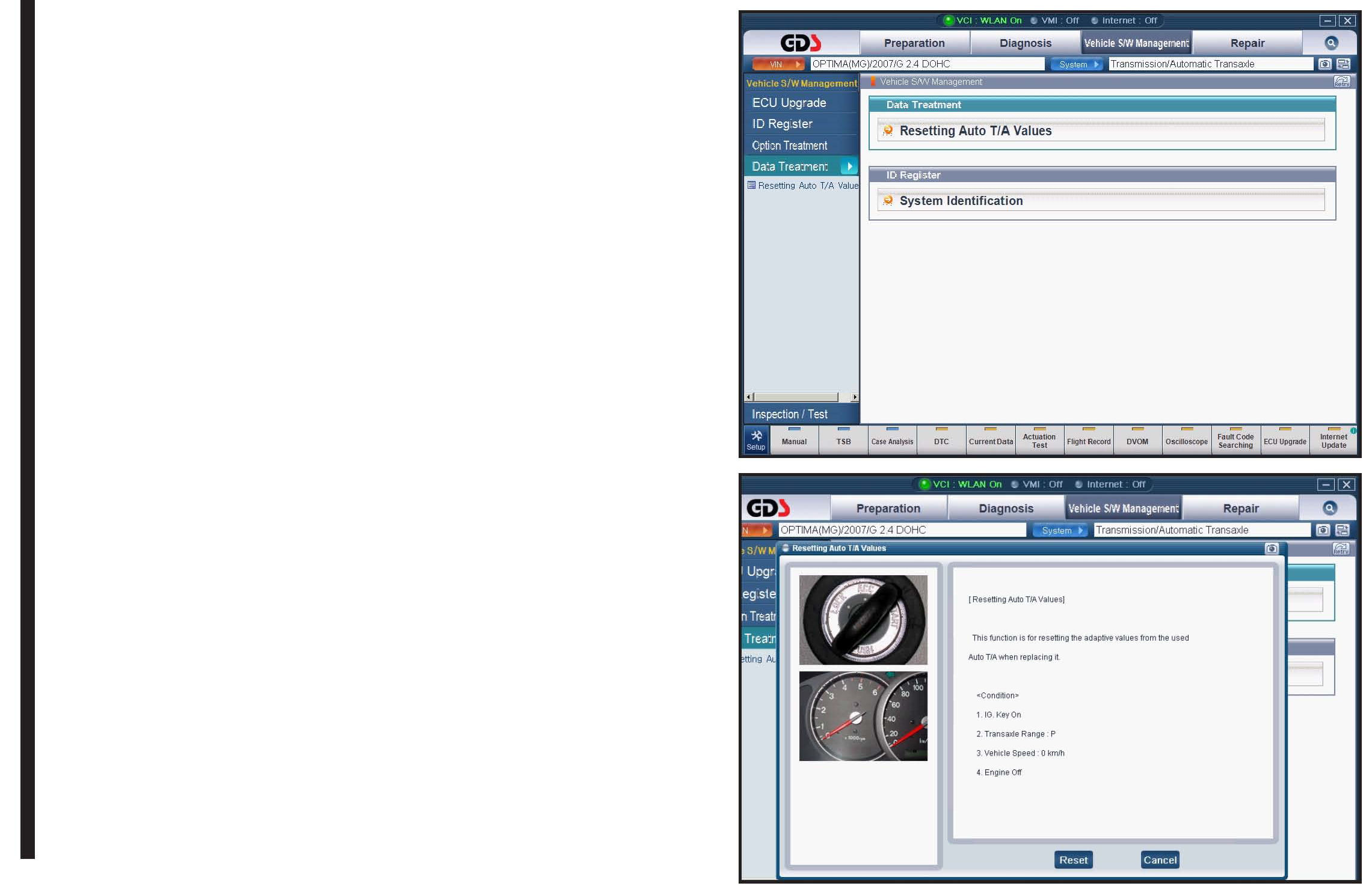 Use the GDS Procedure to reset the automatic transmission adaptive values found in the automatic transmission section menu. Follow the steps shown in RESETTING AUTO T/A VALUES menu sections. This step is necessary to ensure a smooth shift.
