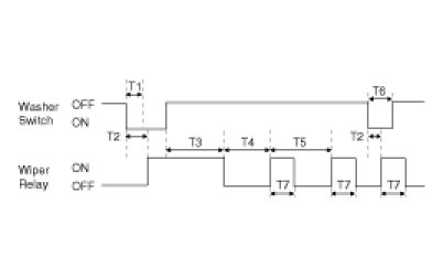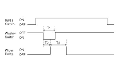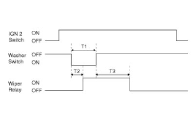 (2) Under "IGN2 SWITCH = ON", WIPER RELAY is turned ON after T2 from "WASHER SWITCH = ON" if WASHER SWITCH is ON for at least T1, and WIPER RELAY is turned OFF after T3 from the moment that WASHER SWITCH is turned OFF.