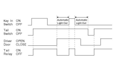 (3) TAIL RELAY is turned OFF if the state is changed from "KEY IN SWITCH = ON" & "TAIL SWITCH = ON "to "KEY IN SWITCH = OFF" & "TAIL SWITCH = ON" & "DRIVER DOOR = OPEN". (automatic light out)