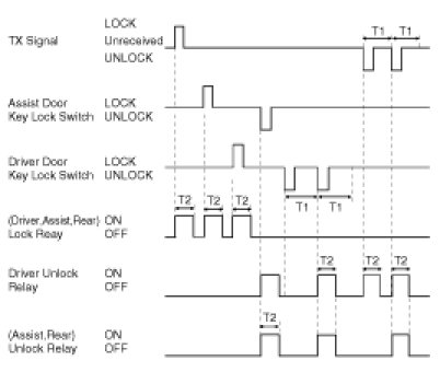(2) DRIVER DOOR UNLOCK signal is output for T2 when TUNLOCK signal is received. But, all DOOR UNLOCK(Driver, Assist, Rear) signals are output for T2 if TUNLOCK signal is received within T1. (All DOOR UNLOCK(Driver, Assist, Rear) signals are output for T2 even when TUNLOCK signal in T1 Is received after changing DRIVER DOOR KEY UNLOCK SWITCH from OFF to ON.