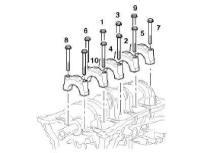 Install and uniformly tighten the 10 bearing cap bolts(A), in several passes, in the sequence shown.