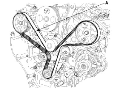 2. Install the tensioner arm assembly(A) and the idler(B).