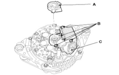 3. Loosen the mounting bolts(B) and disconnect the regulator assembly(C).