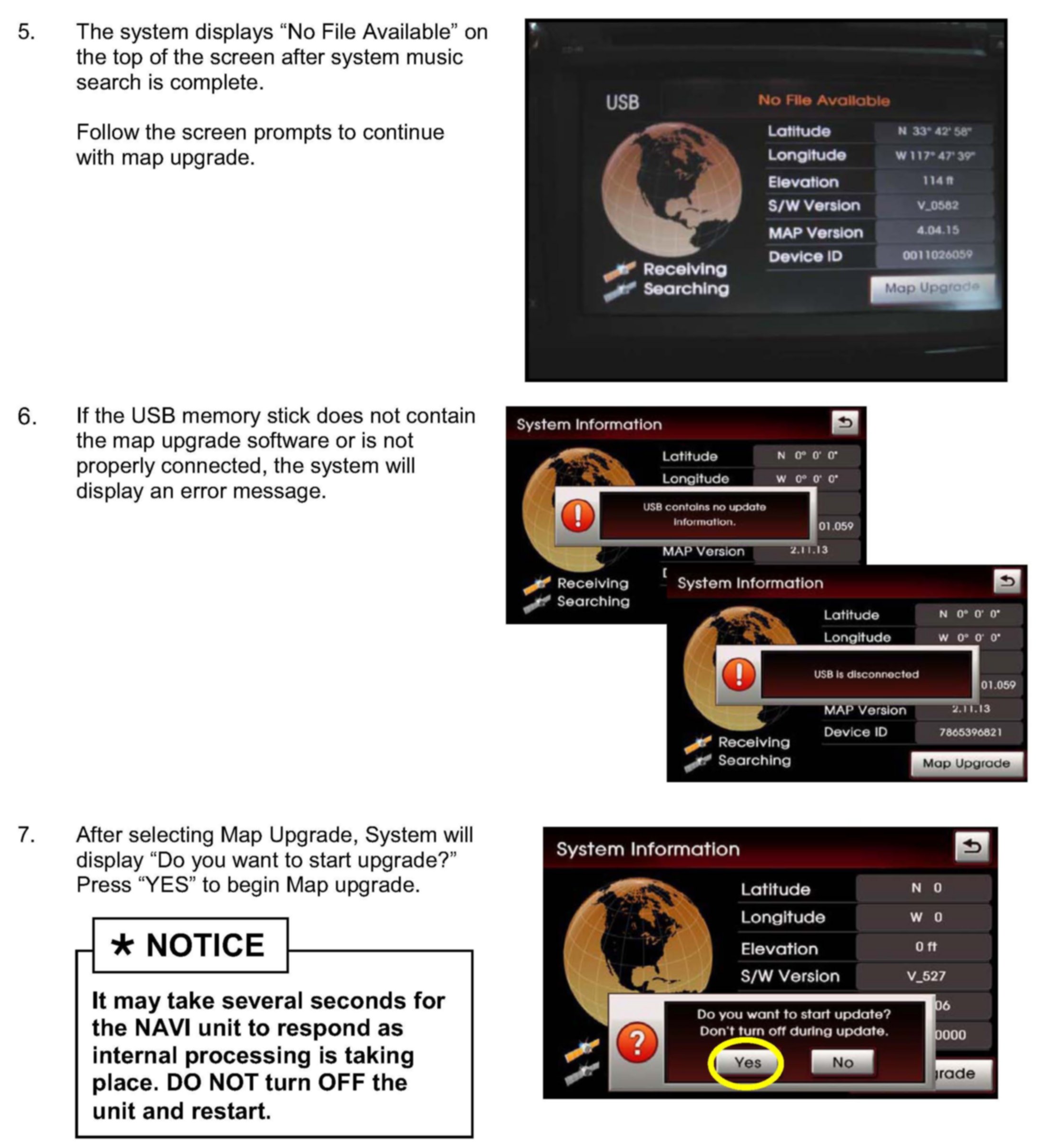 DO NOT start and leave vehicle idling unattended during Map Software upgrade, instead use a battery charger or similar device during upgrade procedure.