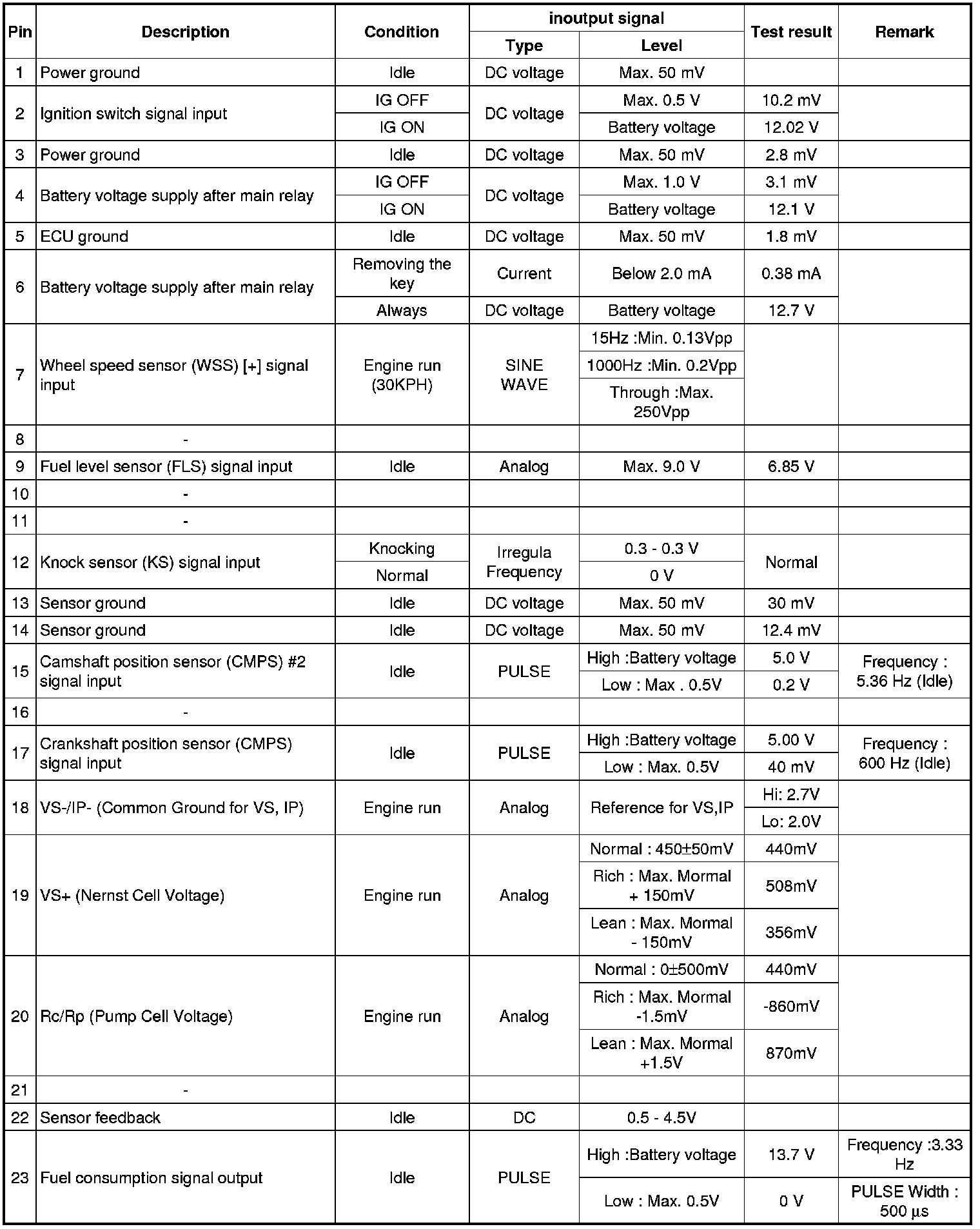 Pinout Values and Diagnostic Parameters