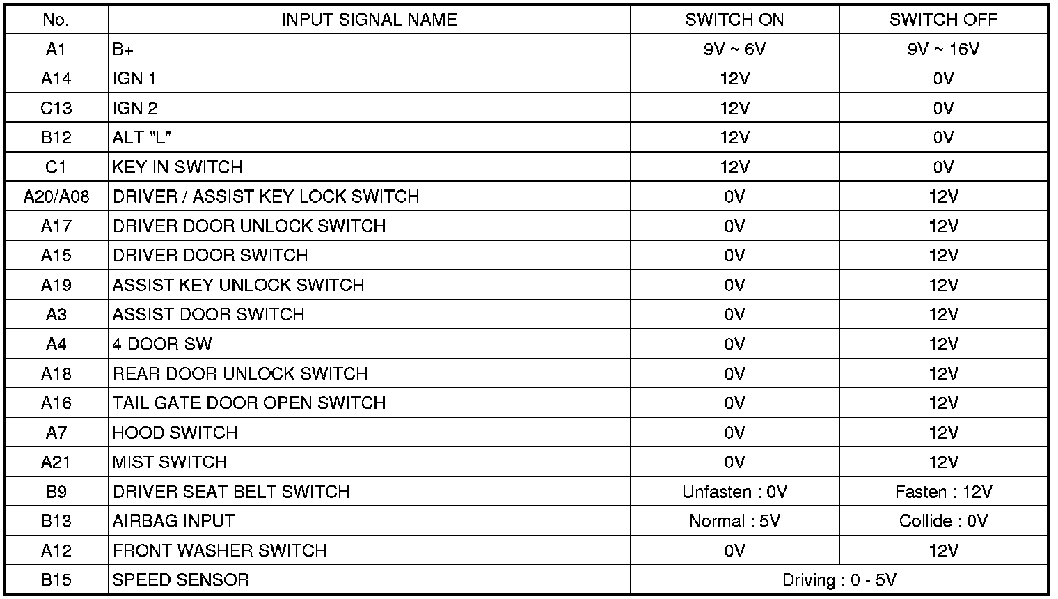 Pinout Values and Diagnostic Parameters