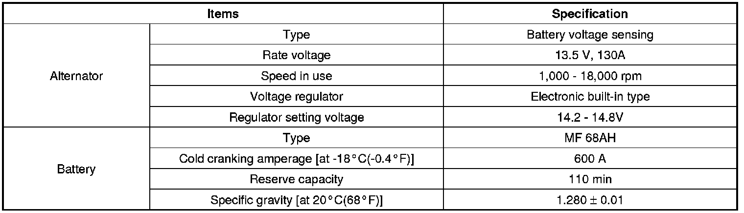 Home >> Kia >> 2009 >> Rondo V6-2.7L >> Repair and Diagnosis >> Specifications >> Electrical Specifications >> Charging System >> System Specifications