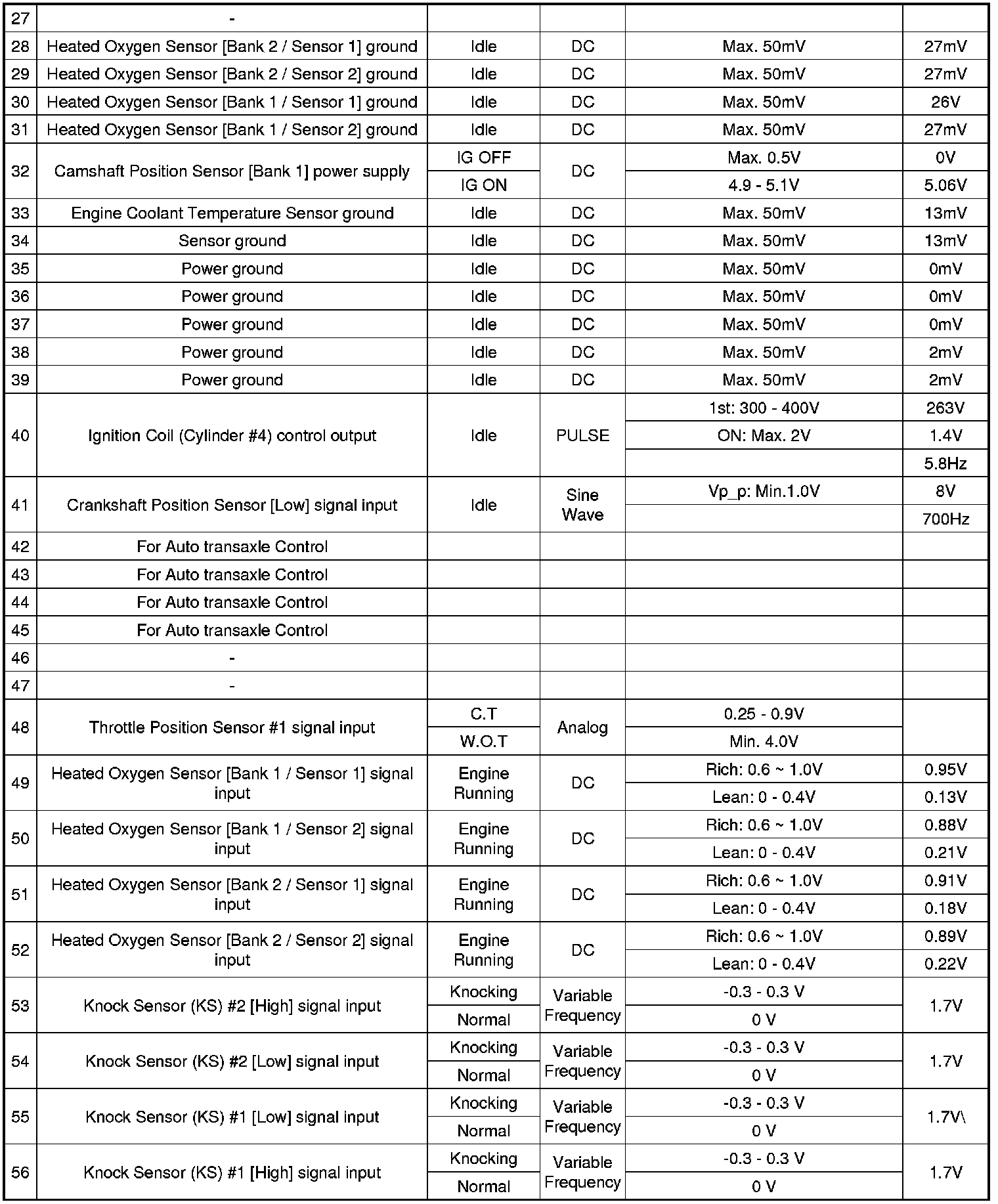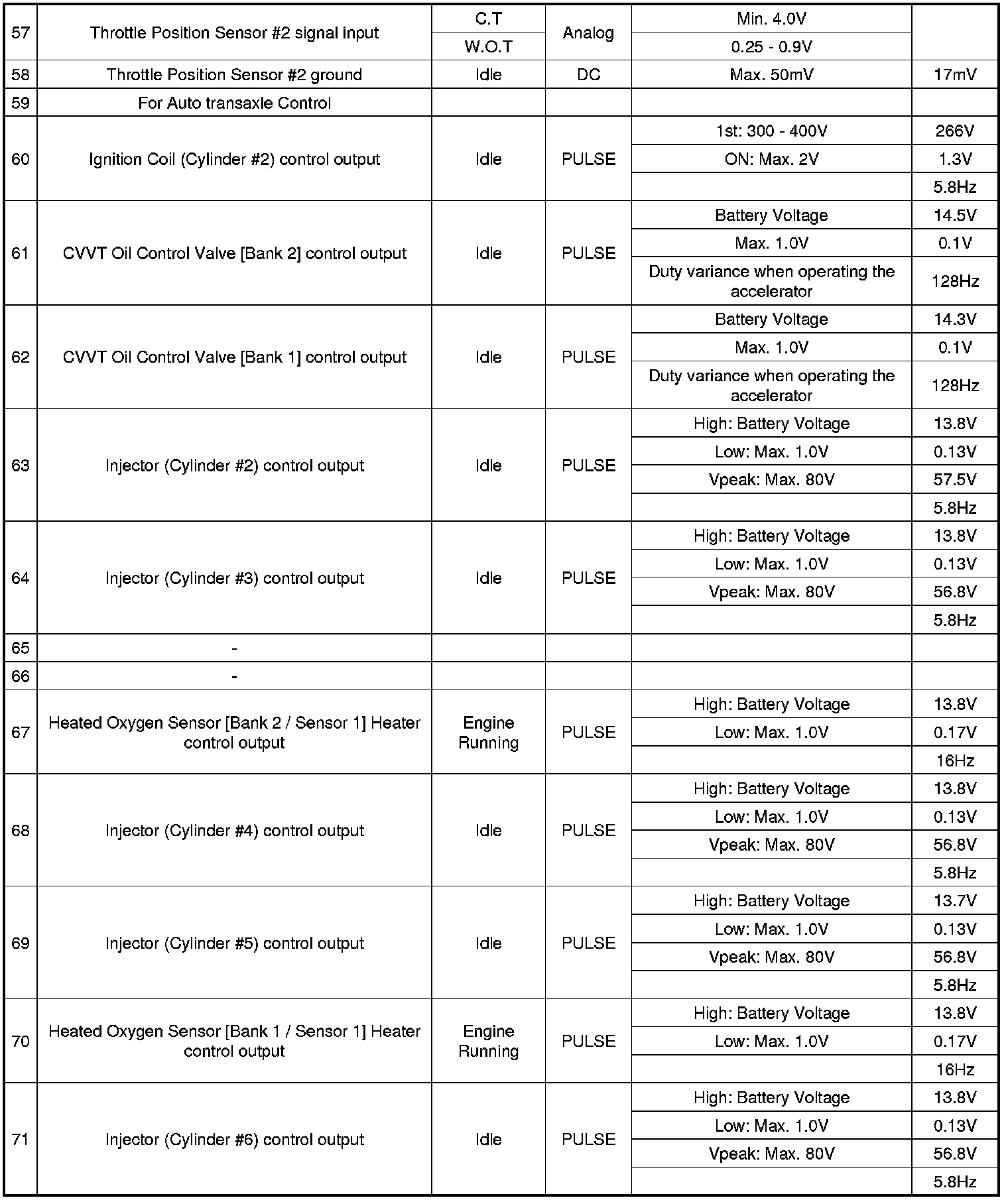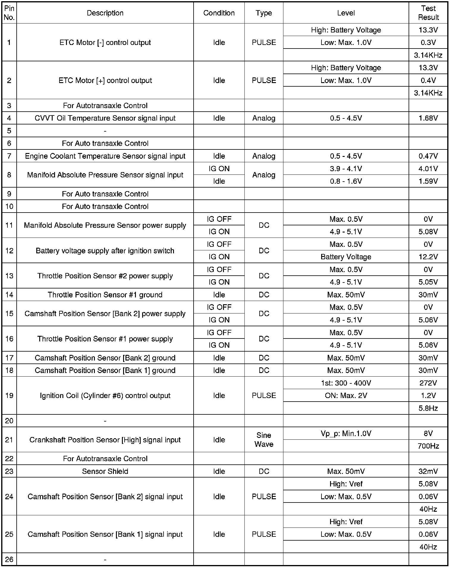 Pinout Values and Diagnostic Parameters
