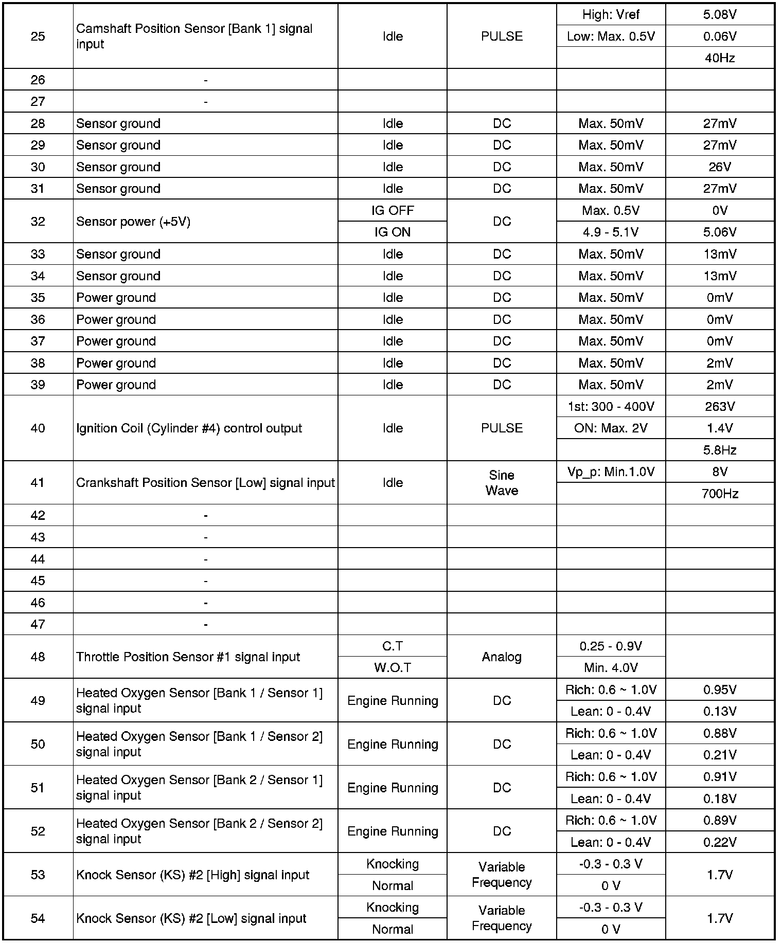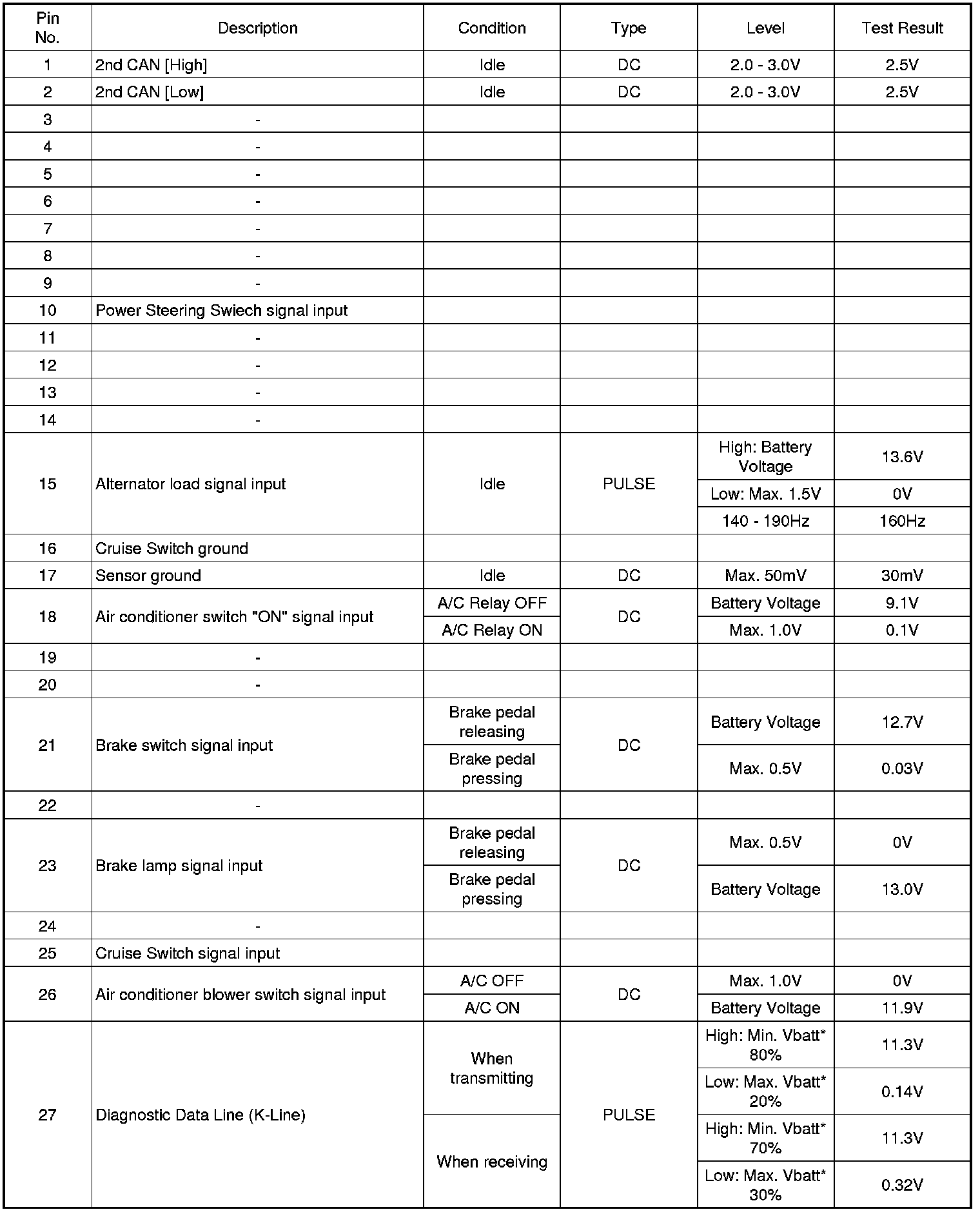 Pinout Values and Diagnostic Parameters