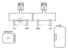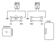 - Disconnect connector (B), and measure for resistance between connector (C) and (B1) and between (B2) and (A) as shown in Fig 3.