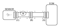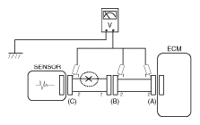 - With each connector still connected, measure the voltage between the chassis ground and terminal 1 of each connectors (A), (B) and (C) as shown in Fig 4.