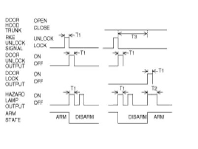 (7) If the UNLOCK signal is sent by the RKE, and either the ignition key is not inserted or entry (door, trunk, hood) to the vehicle is not made within 30 seconds, the LOCK mode will be automatically reset, the hazard lamps will blink, and the Anti-Theft System will rearm. (Key IN = Key Insertion)