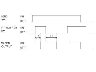 (2) If the washer switch is turned OFF within 0.3 sec.(T1) of the ignition switch the wiper will remain ON for up to 3.8 sec.(T2).