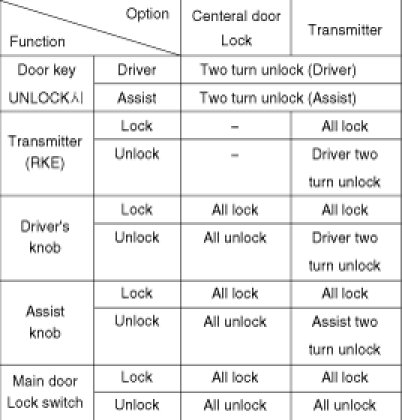 (1) When unlocking the driver door using the driver door key or RKE, only the driver door is unlocked.