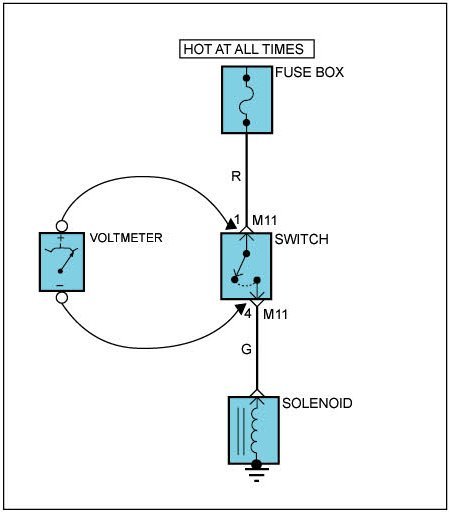 A. Connect one lead of a test lamp or voltmeter to a ground. If you are using a voltmeter, be sure it is the voltmeter's negative test lead you have connected to ground.