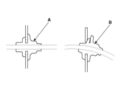 9. Check for loose retainer (A) and rubber seals (B).