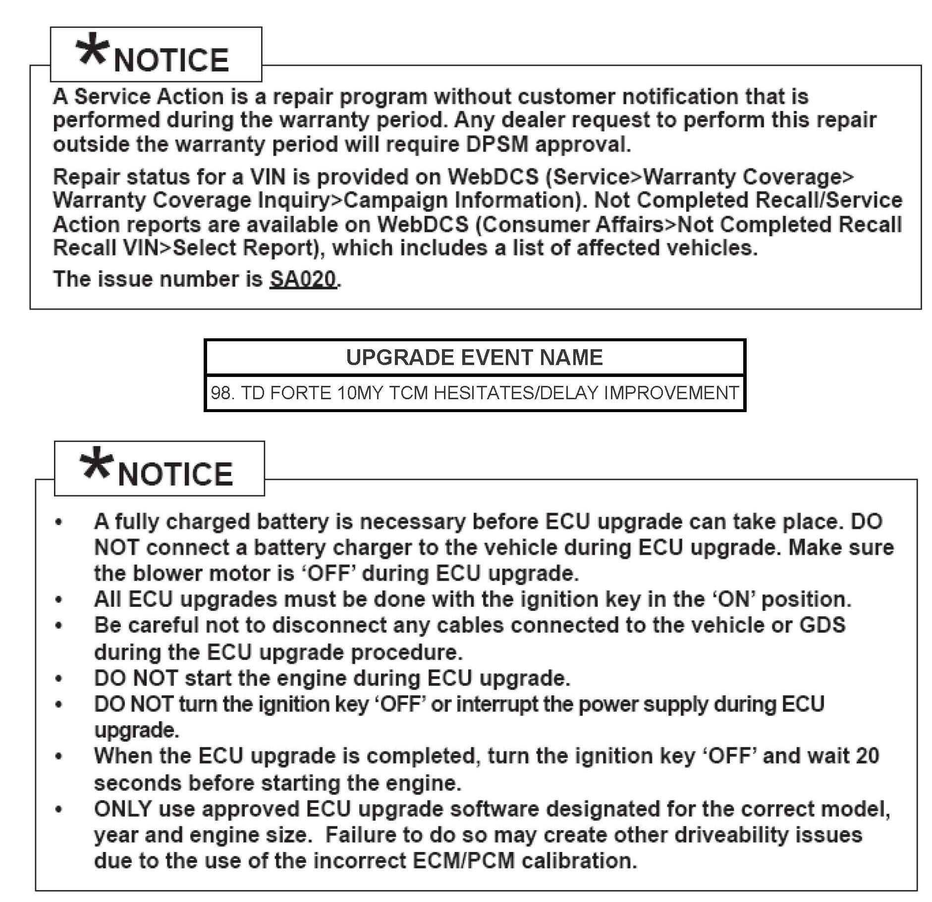 speed automatic transaxles. Some FORTE (TD) vehicles may experience slight shift hesitation and/or transaxle shift delay. This