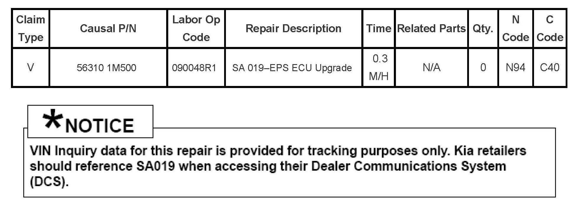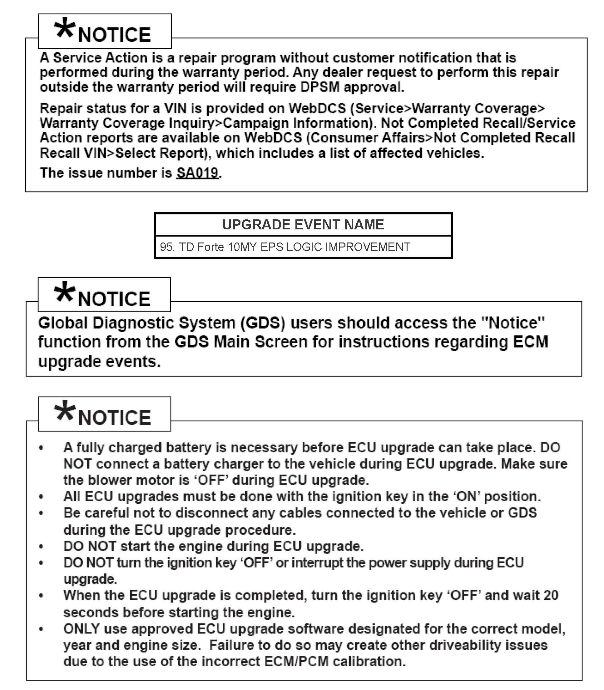 Home >> Kia >> 2010 >> Forte L4-2.4L >> Repair and Diagnosis >> Powertrain Management >> Computers and Control Systems >> Engine Control Module >> Technical Service Bulletins >> Recalls >> Campaign SA019 - PCM Update For EPS MIL ON/DTC C2412