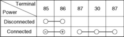 1. There should be continuity between the No.30 and No.87 terminals when power and ground are connected to the No.85 and No.86 terminals.